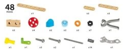 Das Set wird im praktischen Werkzeugkoffer geliefert, in dem alle Bestandteile nach dem Spielen schnell verstaut werden können. Die Bauteile sind z.T. aus Holz, z.T. aus Kunststoff. • ab 3 Jahren • 48 tlg.