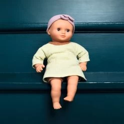 Babypuppe Pistache von Djeco hat ihr erstes Outfit gleich dabei. Eine wunderbare Puppe zum Einstieg in die Puppenspielwelt. Diese Puppe ist mit einem Kleid und einem Kopftuch aus schönem Doppelgaze-Material aus 100 % Baumwolle bekleidet. Die Farben sind sehr sanft und harmonisch gehalten.