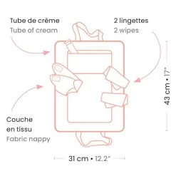 • Inhalt: 1 Wickeltasche, 1 Windel mit Klettverschluss, 2 Feuchttücher, 1 Tube Creme (Holz).