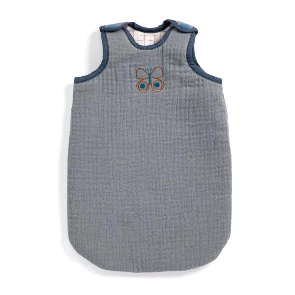 Ein hübscher Puppenschlafsack in Grünblau und Grau mit einem gestickten Schmetterling von Djeco. Das Puppenbaby hat damit sicher eine gute Nacht hat und schläft tief und fest. Mit den Klettverschlüssen an den Schultern ist es ganz einfach, seinen Begleiter hineinzuschieben.