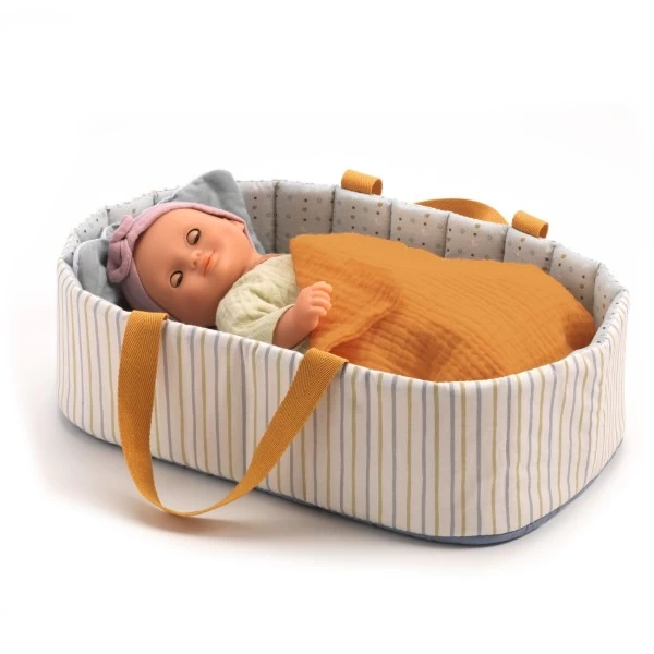 In der Puppentragetasche Blue Lines von Djeco schläft die Puppe sicher traumhaft gut! Eine Decke und ein Kissen sind dabei, so dass es das Puppenbaby sehr gemütlich hat.