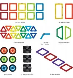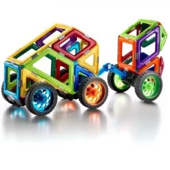 An den Seiten der bunten Kunststoffteile befinden sich magnetische Metallteile, über die sie mit anderen Bauteilen verbunden werden. So ergeben sich unzählige Möglichkeiten, die die Kreativität, das räumliche Denken und die Hand-Auge-Koordination trainieren.