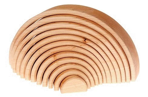 Harmonische naturholzfarbene Holzbögen zum Spielen und Dekorieren. 12 halbrunde Holzbögen passen genau ineinander. Das Natur-Bogenspiel von Grimms ist gestapelt 38 cm lang und 18 cm hoch.