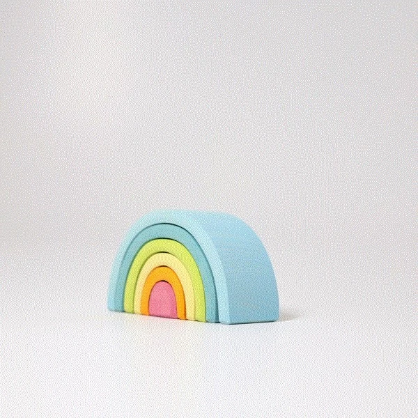 Der kleine wunderschöne Regenbogen „Pastell“ aus Holz bietet viele tolle Bau- und Stellmöglichkeiten. Kleinkinder finden mit diesem Spielzeug immer neue Anregungen. 6 halbrunde Holzbögen passen genau ineinander. Der kleine Regenbogen von Grimms ist gestapelt 10,5cm breit.