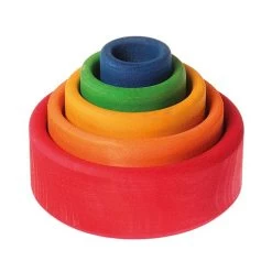 Das 5-teilige Schälchensatzder Firma Grimm´s Spiel und Holz Design kann in- und aufeinander gestapelt, oder im Spiel fantasievoll zweckentfremdet werden. Das Credo der Firma Grimm´s Spiel und Holz Design lautet, Kinder durch vereinfachte, reduzierte Formen bei der Entdeckung der eigenen Kreativität zu unterstützen und zu fördern Durch die Verwendung von Farbbeizen bleibt die Oberflächenstruktur des Holzes erhalten – neben Farbeindrücken wird somit auch der Tastsinn des Kindes aktiviert. Die verwendeten Farbbeizen sind nach der EN 71 gesundheitlich unbedenklich, für Kinderspielzeug geeignet und „spuckecht“. Der Schälchensatz wird in Deutschland gefertigt. Rundum ein schönes und ansprechendes Produkt!