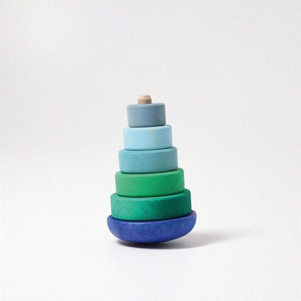 Steckspiele wie dieser kleine Scheibenturm in blau/grün Tönen bereiten kleinen Kindern viel Freude. Die ganz Kleinen bauen den Turm auseinander und wieder zusammen, dabei wird die Auge-Hand-Koordination, die Feinmotorik sowie die Farb- und Größenwahrnehmung geschult. Das besondere hier ist der Runde Rumpf, der sich immer wieder aufstellt wenn er gekippt wird. Ein wackliger Spaß aus Buchenholz.