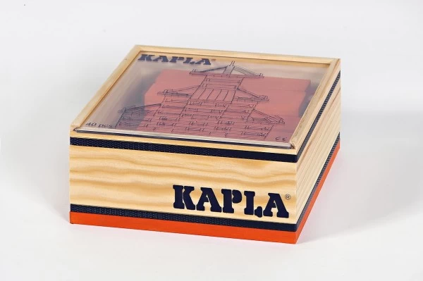 Ein Set aus orangen Kaplasteinen. Die 40er Quadrate von Kapla enthalten 40 Pinienholzplättchen in einer Farbe. Diese können naturfarbenen Kapla-Bauwerken eine individuelle Note und Gestaltung verleihen. Die Holzplättchen von Kapla haben alle die gleiche Größe. Das besondere Maß von 12 x 2,4 x 0,8 cm ermöglicht besonders viele Baukreationen und macht diese Holzbausteine so einzigartig.