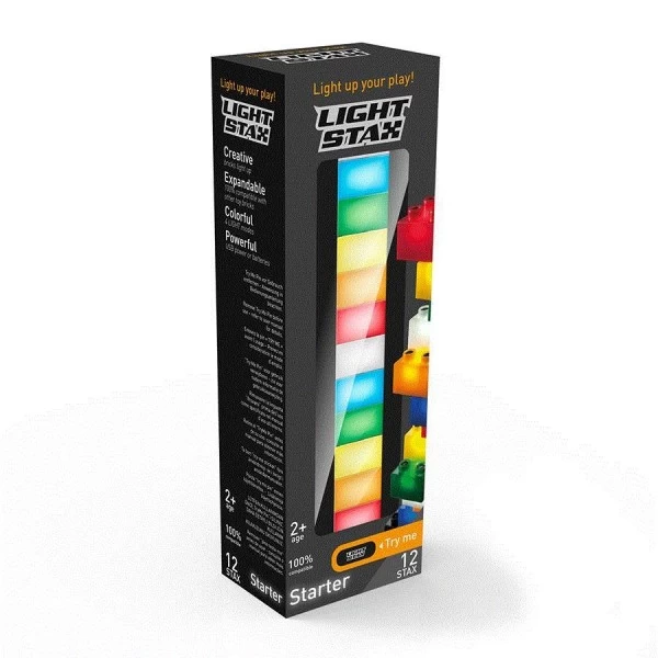 Hier können Sie ein super Einstiegspaket in die Welt der leuchtenden Bausteine von Light Stax bestellen: Das STARTER SET enthält 12 LED Bausteine (mit 4 Noppen) und eine USB Power Base inkl. Batterien und USB-Kabel. Damit lassen sich schon kleine Leucht-Kunstwerke bauen. Empfohlen für Kinder ab 2 Jahren. Wie funktioniert es? Jeder Leuchtbaustein von Light Stax ist mit LED-Technologie ausgestattet. Ohne Stromversorgung wird mit den Steckbausteinen ganz normal gebaut, sie sind mit den herkömmlichen Bausteinen ohne Licht komplett kompatibel. Sobald aber die Power Base Grundplatte mit verbaut wird, kommt Licht ins Spiel. Jeder LED-Baustein, der Steckkontakt zur Grundplatte hat, beginnt zu leuchten. Das funktioniert über ganze Ketten von Steckverbindungen. Super! Die Power Base kann über Batterie versorgt werden oder auch mit dem beiliegenden USB-Kabel. Tipp: Mit einem Handy-Ladegerät habe Sie den passenden Stecker zur Hand, um das USB-Kabel der Lightstax auch an der Steckdose nutzen zu können. • Light Stax JR. Starter Set. • Inhalt: 12 LED Bausteinen/Bauklötzen (je 2 x 6 verschiedene Farben im Format 2×2) und USB Power Base (inkl. Batterien 3x AAA und USB-Kabel). • Von Fips und dem Hersteller ab 2 Jahren empfohlen. • Vier Leuchtfunktionen: permanent, blinken, dimmen, 15-Minuten-Timer. • Kompatibel mit anderen Steck-Bausteinen. • Wichtiger Tipp: Nicht in die Spülmaschine! Die LEDs wollen nicht in Wasser getaucht werden!