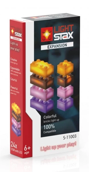 24 zusätzliche Leuchtbausteine in lila, rosa, orange und braun. Es sind Stax mit 4 Noppen und mit 8 Noppen enthalten.