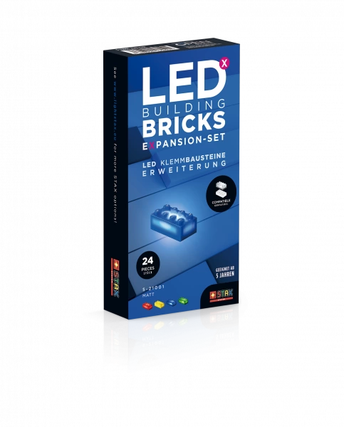 Im Expansion Set „2×4 Matt“ sind 24 bunte LED-Klemmbausteine passend zum Stax System enthalten. Stax System ist ebenfalls kompatibel zu Klemmbausteinen vieler anderer Hersteller. • Empfohlen ab 5 Jahren